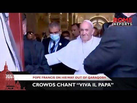 Crowds chant “Viva il Papa” on his way out of Qaraqosh